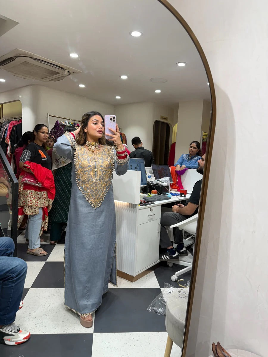 Step into effortless elegance with this soft denim straight kurta, designed for comfort without compromising on style. The breathable denim fabric drapes beautifully, while the neckline and front are richly adorned with gold zari embroidery and delicate mirror work that add just the right touch of festive sparkle.